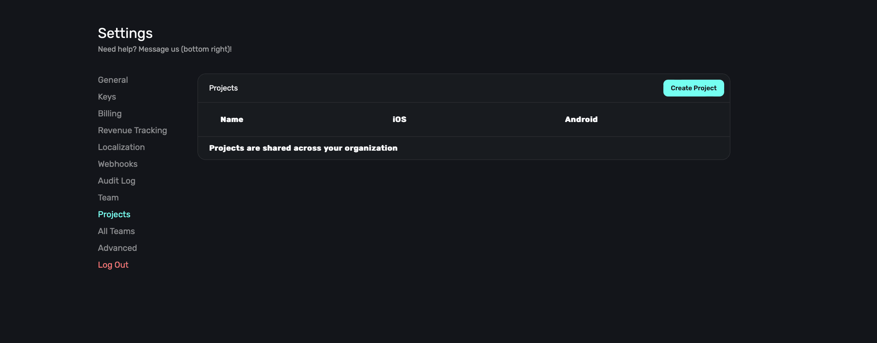 To create a new project, click the Create Project button at the top right: