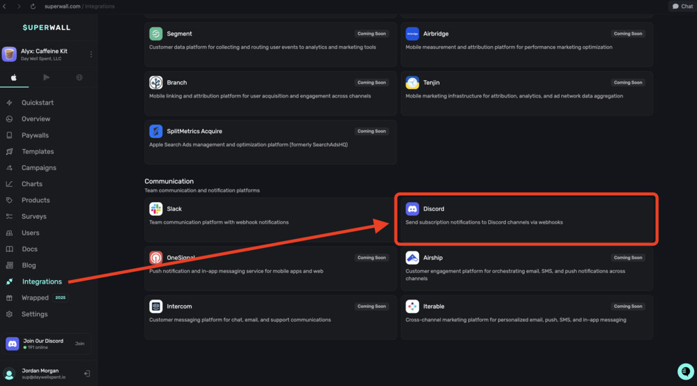 In the Communication section within Integrations, you can connect your Discord account to Superwall: